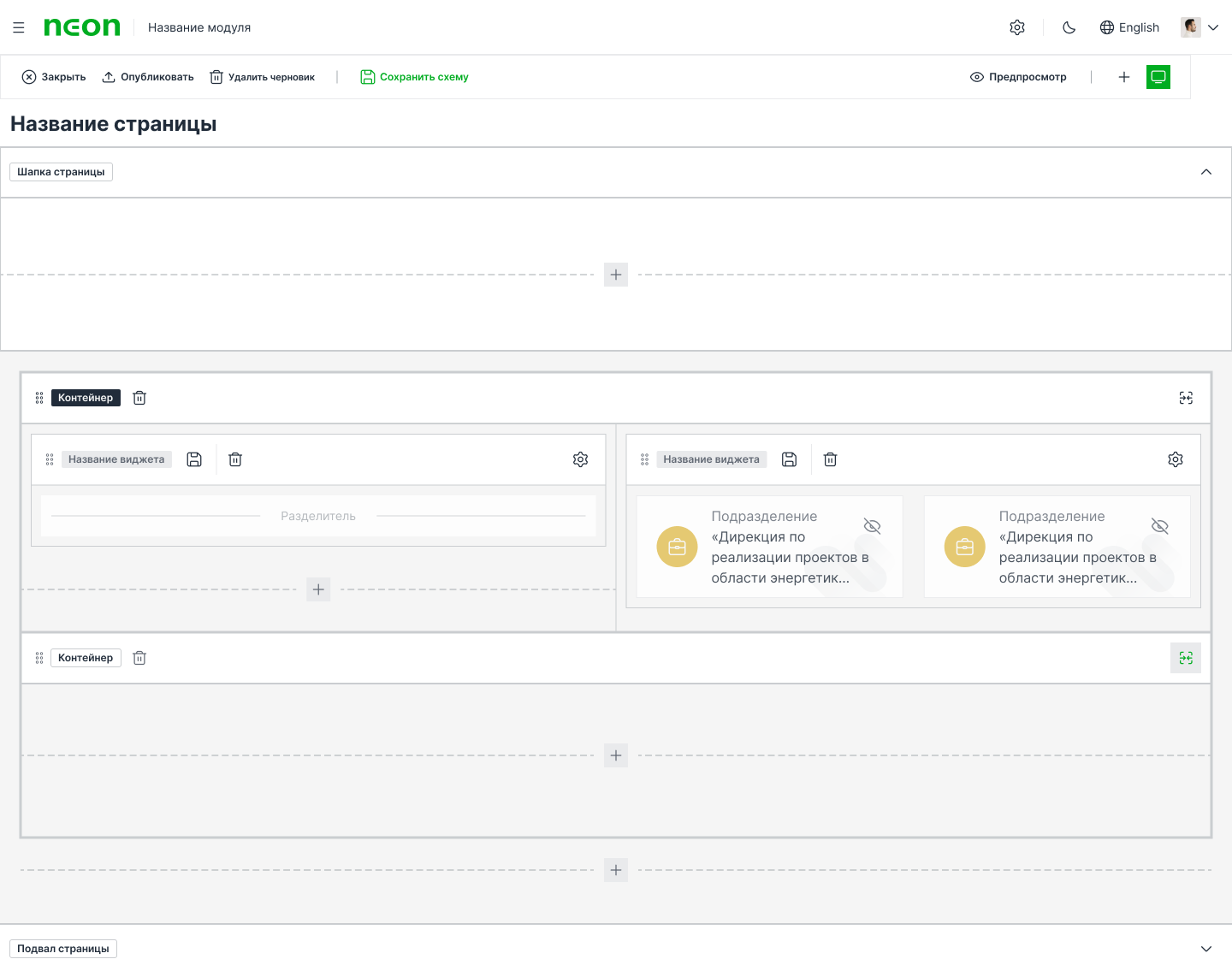 Теперь администратор системы самостоятельно может создавать новые страницы модулей, наполнять их виджетами из библиотеки, настраивать расположение, хранить и редактировать версии.